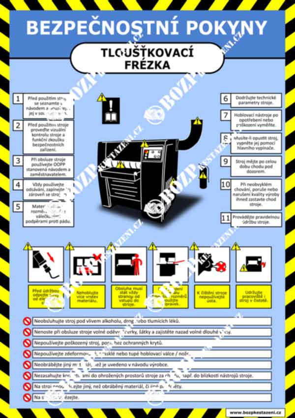 Tloušťovací frézky je skvělým pomocníkem, který však při nevhodném způsobu obsluhy dokáže nepěkně ublížit! Vyvěste proto u svých tloušťovacích frézek přehledné, grafické bezpečnostní pokyny a dejte tak zaměstnancům na vědomí správné způsoby a zásady obsluhy těchto zařízení!