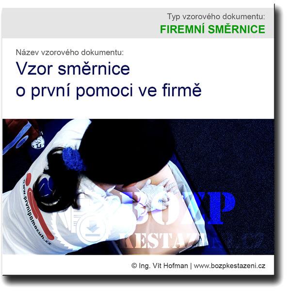 První pomoc (PP) je definována jako soubor jednoduchých úkonů a opatření, která při náhlém ohrožení nebo postižení zdraví člověka omezují rozsah a důsledky tohoto ohrožení či postižení. Dle trestního zákoníku je poskytnout první pomoc v rámci svých schopností a sil povinen každý občan České republiky, pokud tím neohrozí svoje zdraví či život. Nelze se domnívat, že i při sebelepším zajištění bezpečnosti a ochrany zdraví při práci (BOZP), nemůže k úrazu dojít. Navíc to nemusí být přímo úraz, ale může jít o neúrazový stav, jako jen infarkt myokardu, mozková mrtvice, epileptický či diabetický záchvat nebo desítky a možná i stovky dalších, život ohrožujících stavů. Zaměstnavatel se tedy musí vypořádat i s poskytováním první pomoci na pracovišti. Vzor směrnice o první pomoci ve firmě obsahuje ustanovení o prostředcích k poskytnutí první pomoci, ale také o požadavcích na školení první pomoci zaměstnanců. Součástí směrnice je také příloha o přehledu lékárniček první pomoci na pracovištích zaměstnavatele a další příloha o přehledu vybavení jednotlivých lékárniček první pomoci.